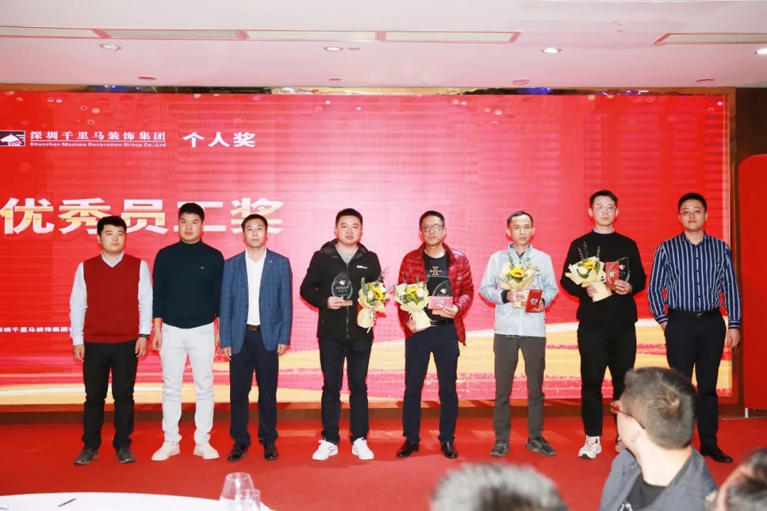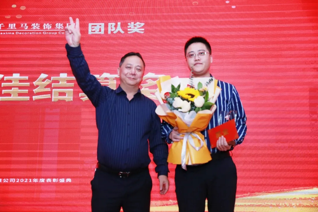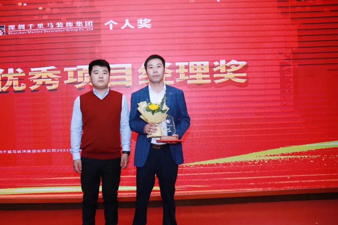 隨后,千里馬裝飾李向東董事長、李文學總經理、朱建國副總經理、丁利斌副總經理等領導分別為2021年度優秀團隊及個人進行了表彰頒獎,這其中有公司的新人,也有見證公司歷程的元老,更有一批與公司長期同發展、共進步的項目管理人員,現場全體人員為他們獻上了最熱烈的掌聲,感謝他們為公司創造的卓越成績,鼓勵他們為公司做出更大貢獻。