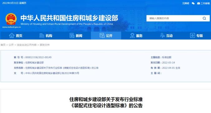 3月31日,住房和城鄉(xiāng)建設(shè)部發(fā)布行業(yè)標(biāo)準(zhǔn)《裝配式住宅設(shè)計(jì)選型標(biāo)準(zhǔn)》,編號為JGJ/T494-2022,自2022年4月1日起實(shí)施。該標(biāo)準(zhǔn)適用于裝配式混凝土結(jié)構(gòu)和裝配式鋼結(jié)構(gòu)的住宅設(shè)計(jì)。